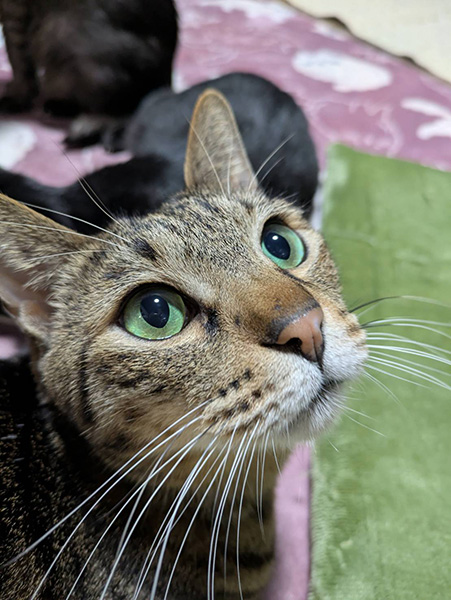 柄は日本猫の中で一番多いと言われている「キジトラ」で、長くてスリムな尻尾と大きな体がティガーくんの特徴です。